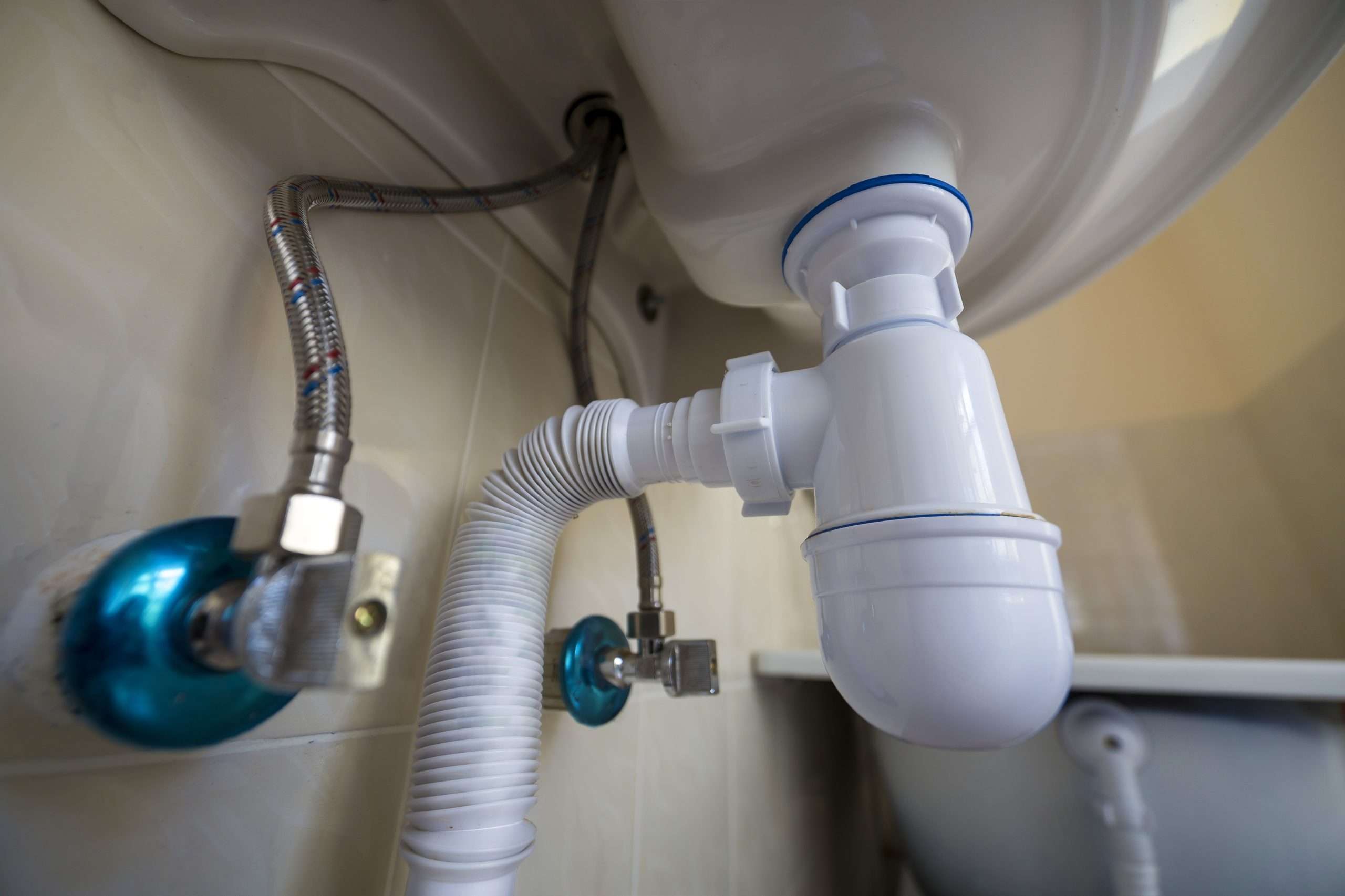 Bottom view of new white washbasin sink connected to sewer on background of bathroom light beige ceramic tiles. Professional plumbing and installation concept.