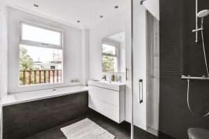 Stylish bathroom design with black tiled floor and walls