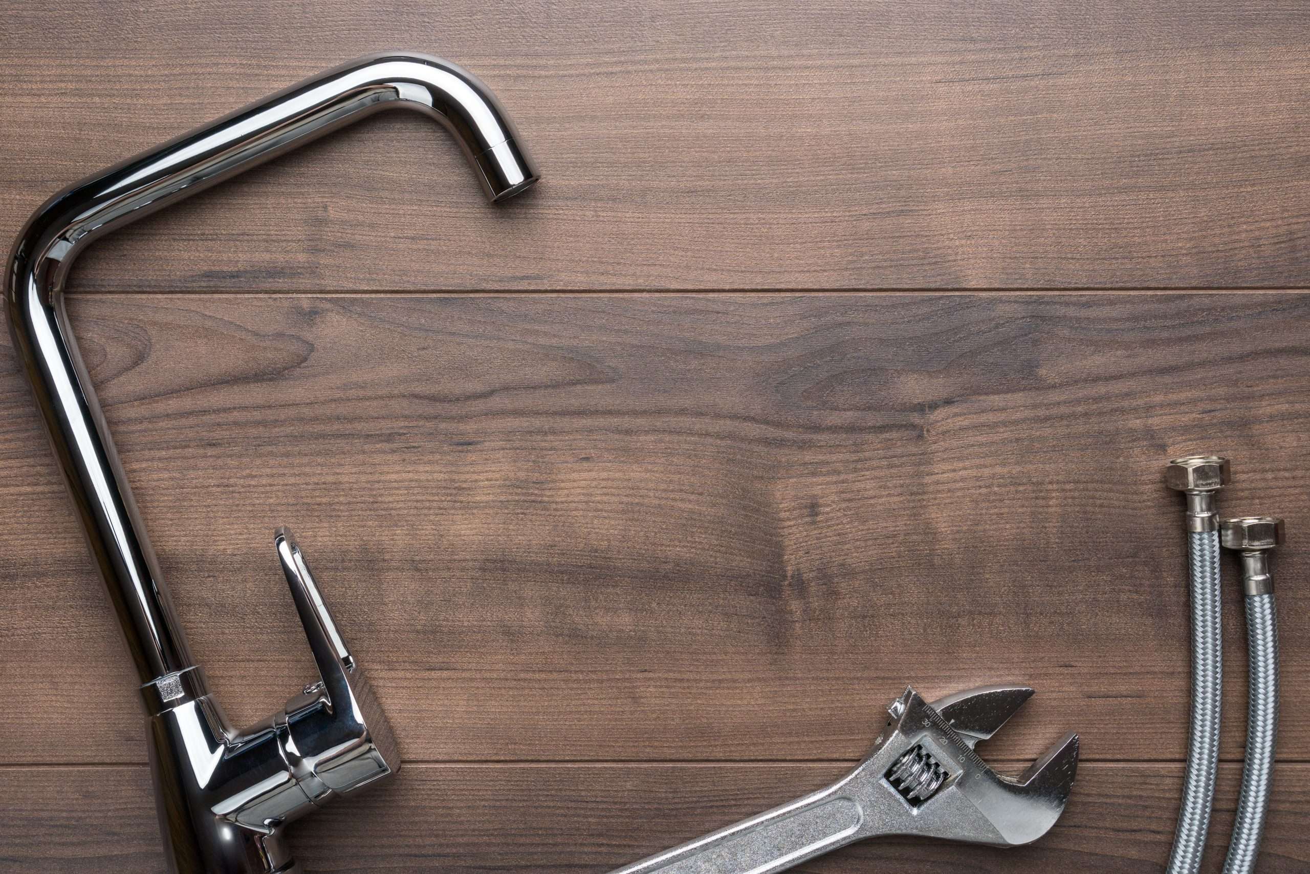 Tap, wrench, flexible hose connectors over wooden background with copy space