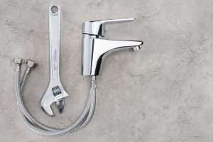 top view of water mixer and pipe wrench on concrete surface